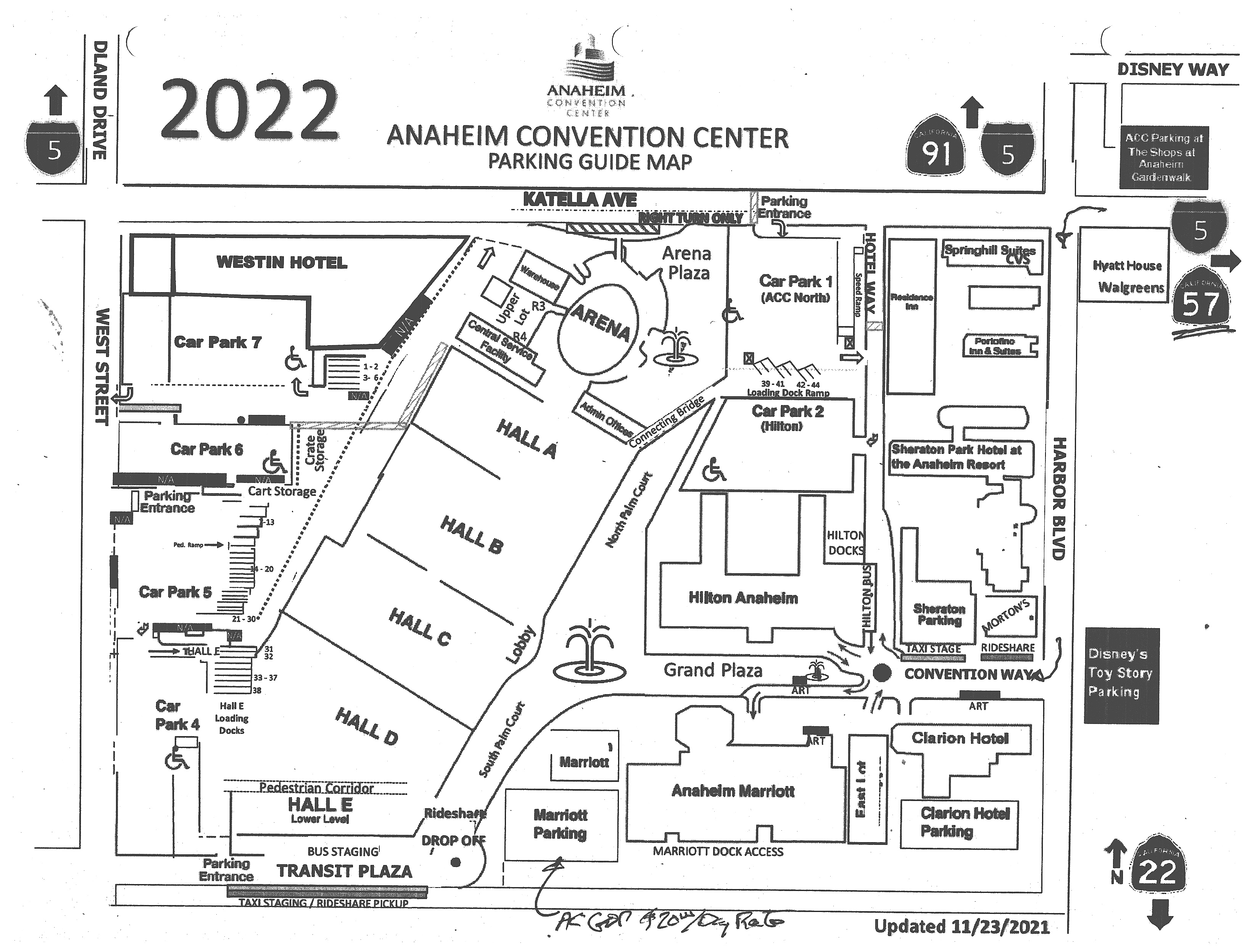 - Take Katella Exit West to Harbor Blvd stoplight. Turn left (south) to stoplight at Convention Way. Turn right (West) into that cul-de-sac. Go around the small traffic circle to get to the Marriott, continue past the Lobby into an alleyway to the Parking Garage (entered from the north).