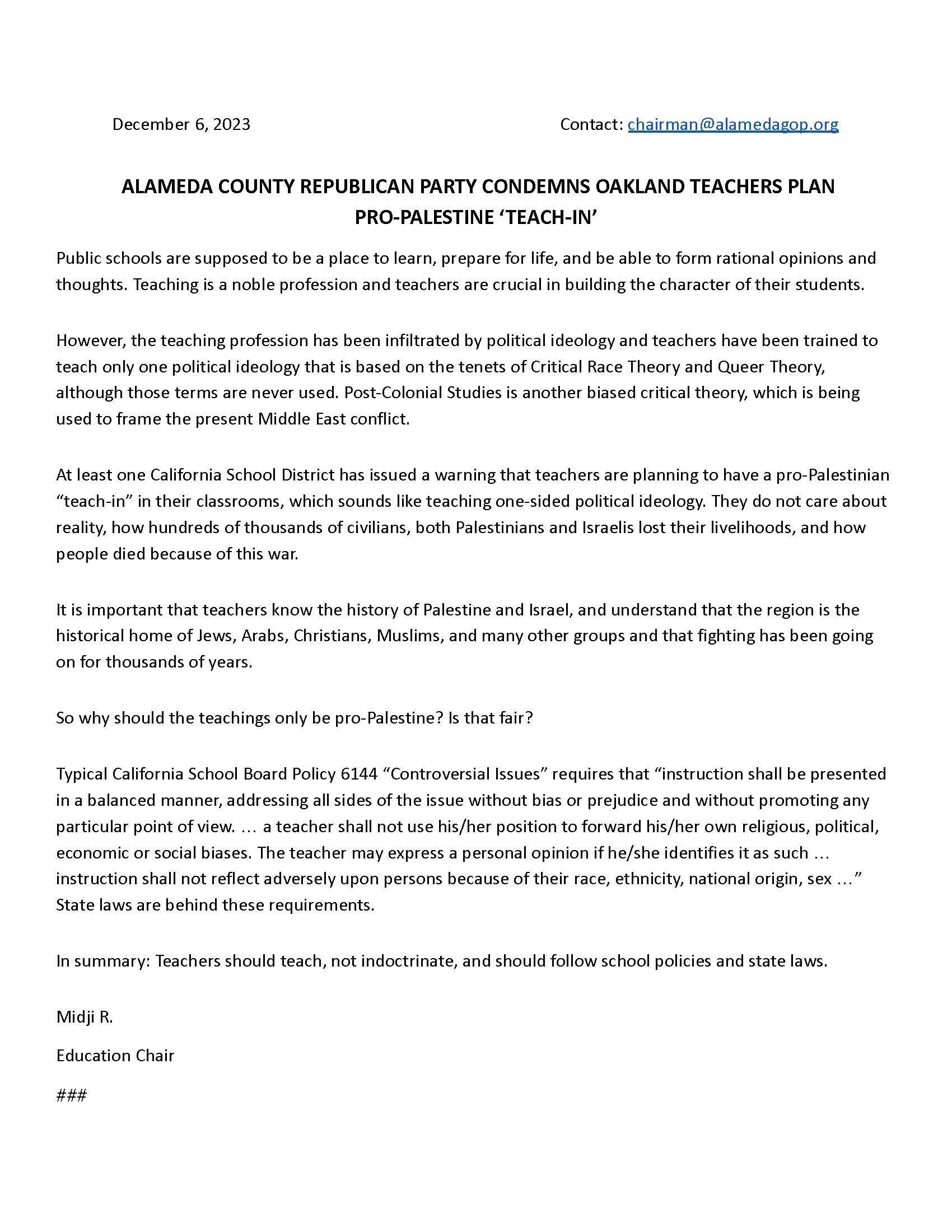 12/6/2023 - Education Team condemns Palestinian-only side of story in schools. See letter from Midji: Letter